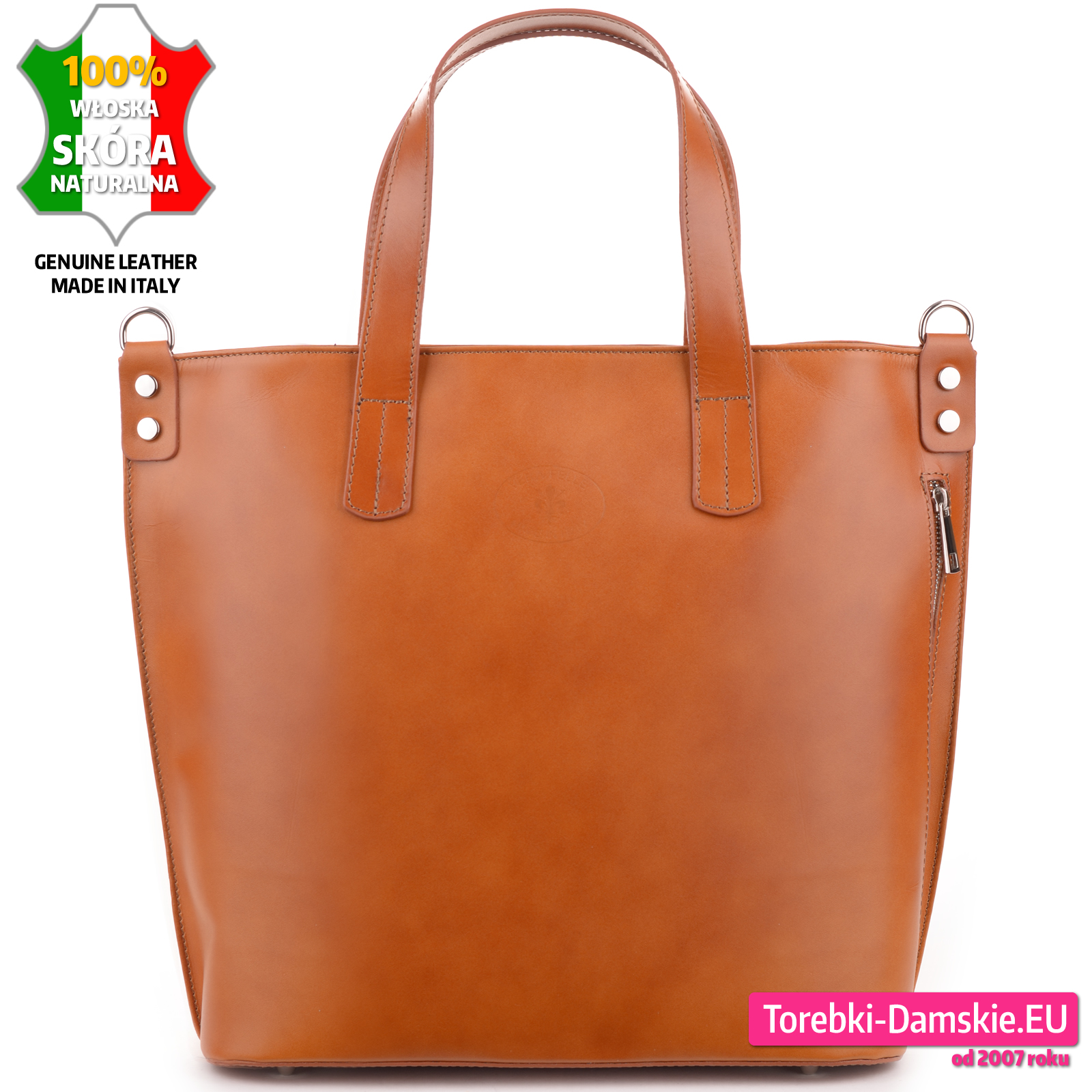 Skórzana duża jasnobrązowa ruda karmelowa shopperka włoska