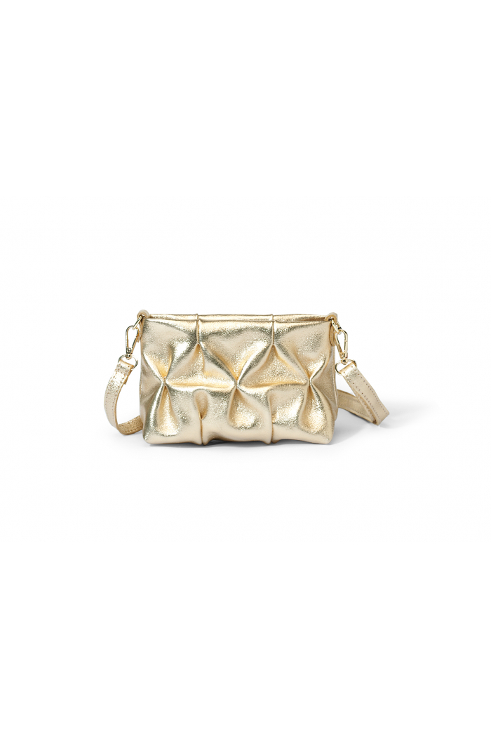 Mała złota torebka wykończona metalizowaną powierzchnią